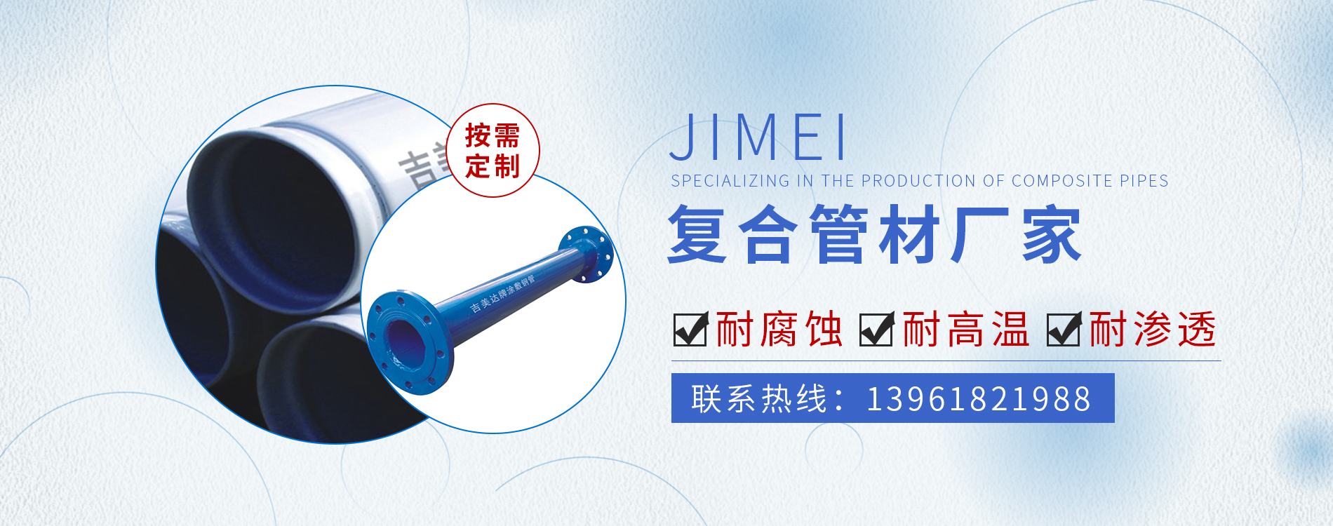 常州市吉美管業(yè)有限公司,是一家專業(yè)生產(chǎn)復(fù)合管材的生產(chǎn)企業(yè)。 依靠公司技術(shù)力量和多年的實踐經(jīng)驗,可年生產(chǎn)內(nèi)襯塑、內(nèi)襯外涂、內(nèi)外涂PE、PEX、EP復(fù)合管道以及工業(yè)防腐管道等多種復(fù)合管材及管件10萬噸的生產(chǎn)能力。